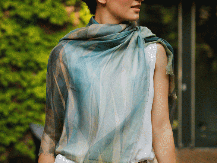 “My background is in architecture, hence my love for clear lines and subtle choice of colors,” says Fariba Soltani of her uncommon transition from a successful career in architecture to producing original prints and textiles for her collection of scarves. These ensemble-emphasizing accessories offer a pleasing juxtaposition of angular abstraction and symmetry with fluid patterns that represent natural elements like fire and stone for a truly unique product.