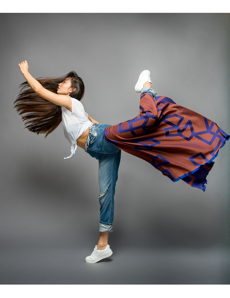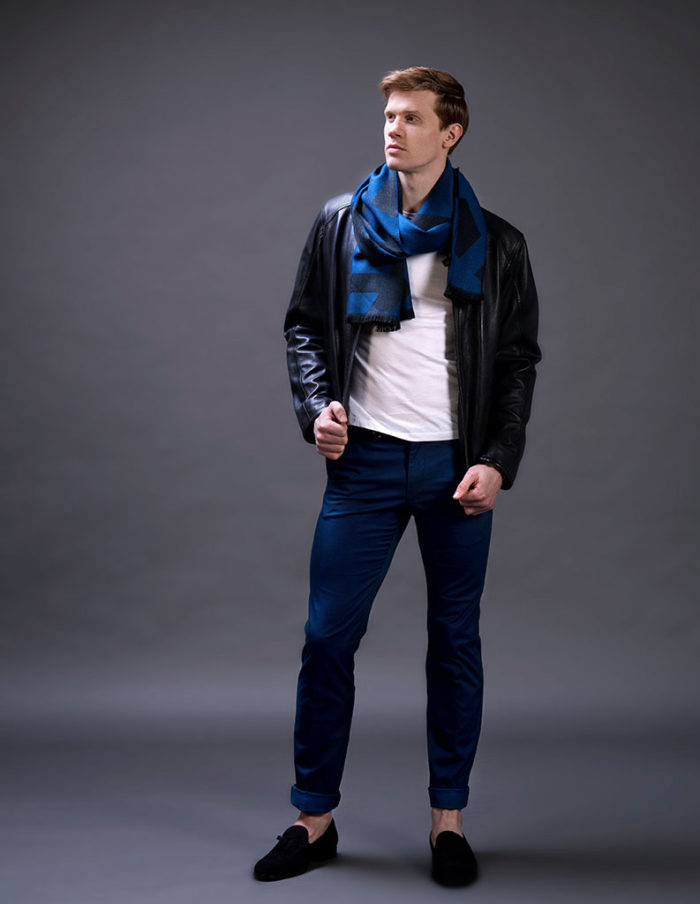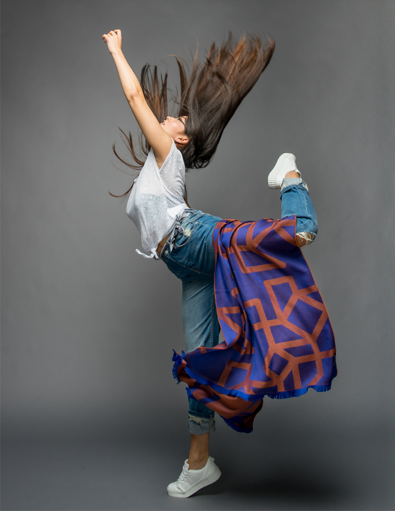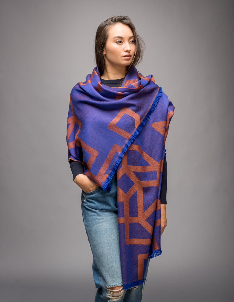 The Narin is a reversible women blanket scarf in mutton red and cobalt blue colour combination. This beautiful piece is decorated with an abstract geometric pattern. Whether it is worn with a winter coat or draped around your neck, its colours makes this scarf a versatile winter accessory. Crafted in Italy, this oversize pure virgin wool scarf had been woven by a Jacquard loom and finished with a gentle fringe trim on short sides.