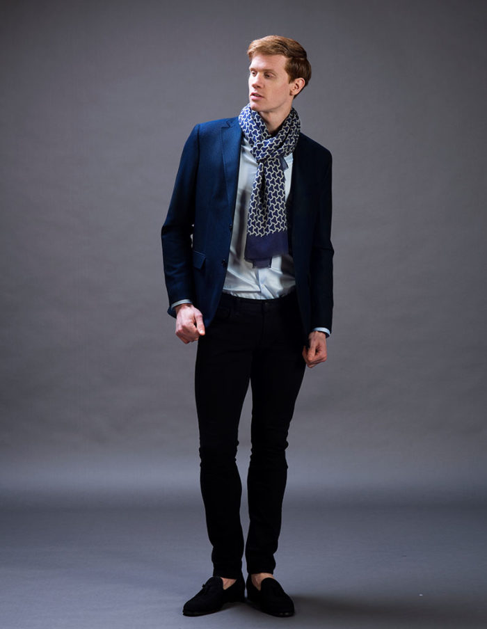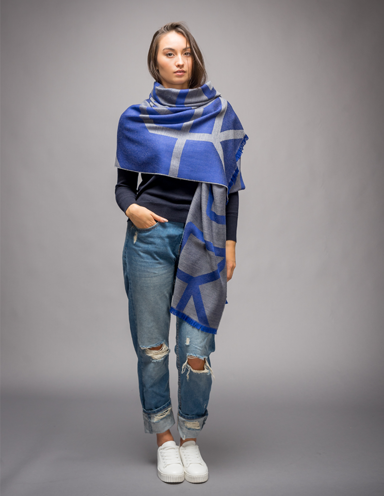 This reversible scarf in grey and navy colour combination is a a Jacquard scarf made of find virgin wool. This eye-catching bold design and colour scheme is the sartorial finish to anyone’s look. Modern in colours and design, it will suit a minimalist look as well as more sophisticate style. Crafted in Italy, is as much utilitarian as it is a style statment for this season.