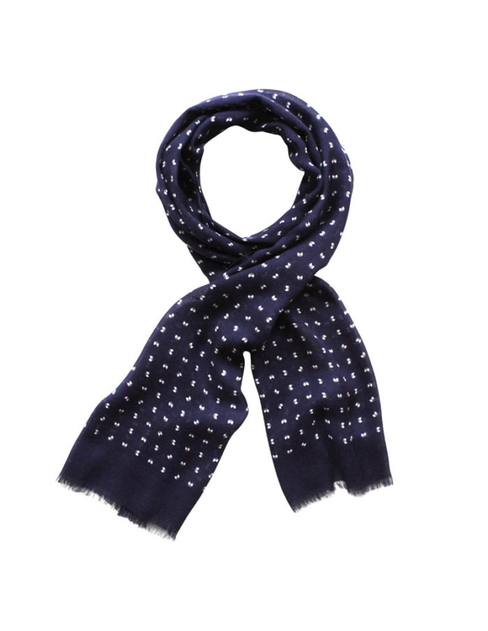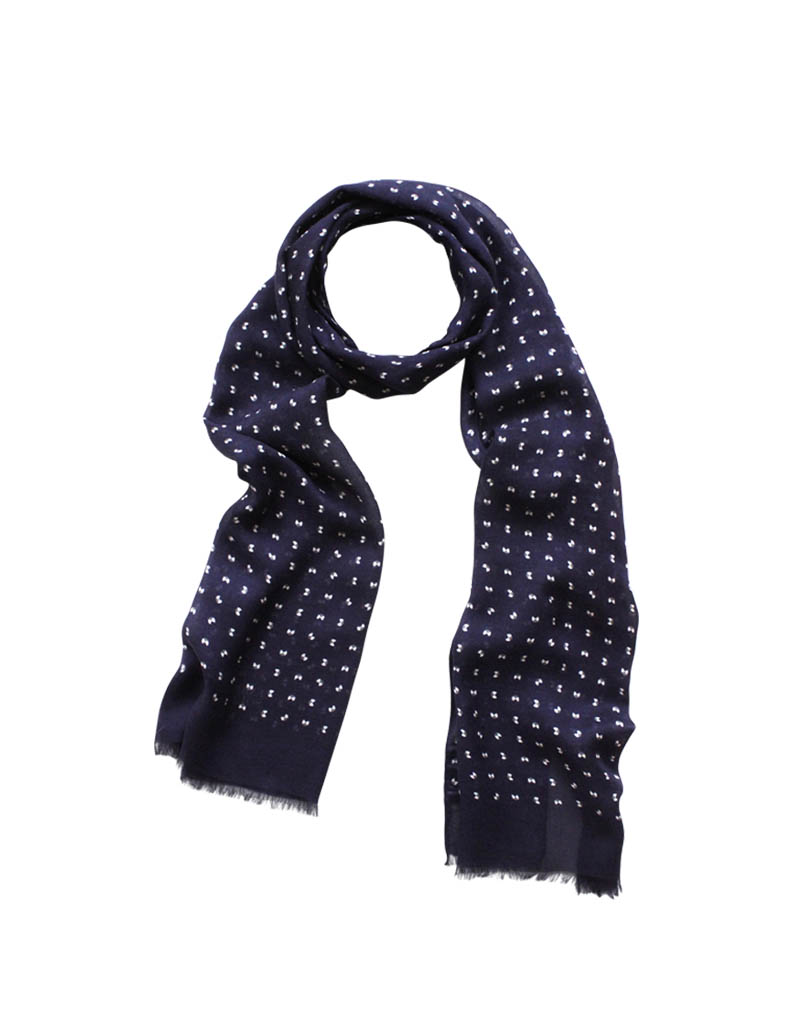 The Hotan, navy dotted men’s scarf boasts a timeless geometric print of dotted elements that they rotate throughout the print. Crafted in modal cashmere blend fabric, this super soft men’s scarf come in two colours, navy blue and burgundy. This light weight scarf with its geometric pattern is a perfect accessory for all-year-round and matches any plain colour outfit/suits. You can opt to achieve a casual look with it, wearing it with jeans and white or navy top or accompany it with your formal suit.