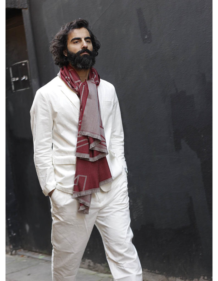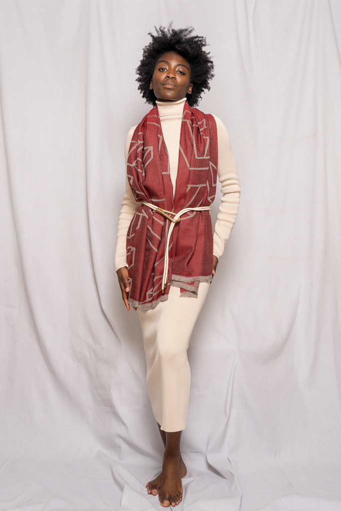 This red shawl is crafted in 100% virgin wool, beautiful in look and soft in touch. The colours are composed of light red and taupe, making it a very chic statment piece to match against a dark backdrop of black, navy or grey.