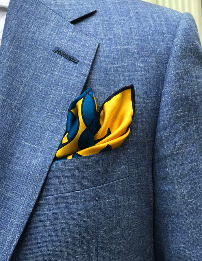 Cut from twill silk and printed with a bright yellow and sharp blue geometric pattern with beautifully crafted border piping in navy, this Italian made pocket square is definitely bold in expression and pops on any outfit you match it with.