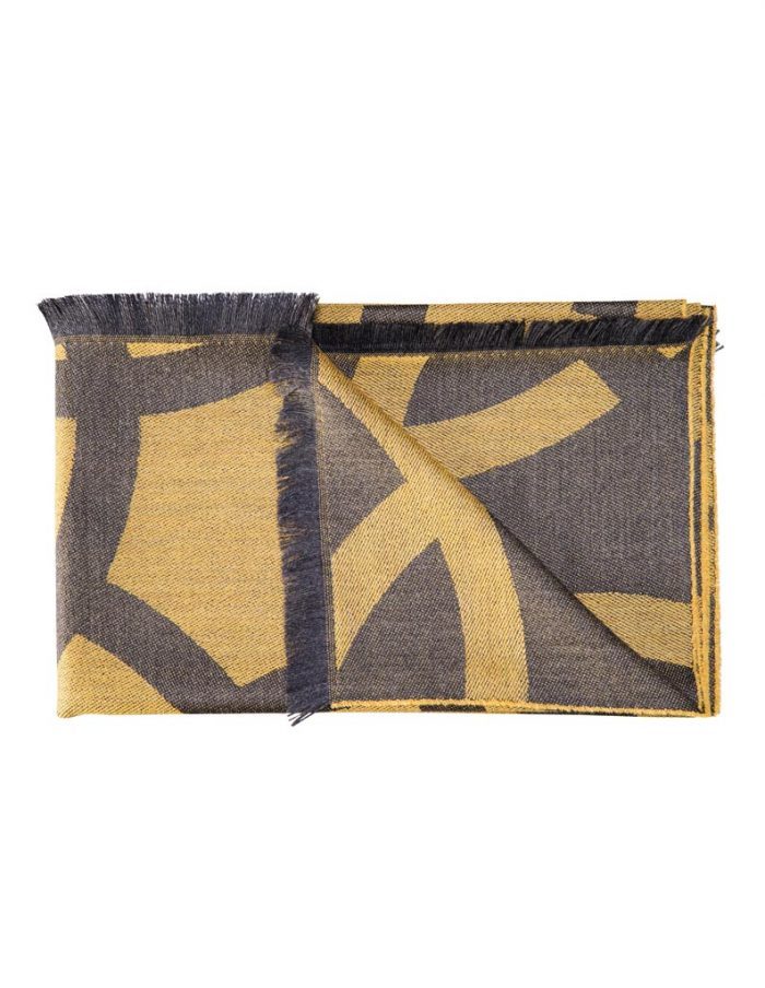 A signature pattern of interlocking rings make Fariba Soltani’s fringe trim wool scarf a timeless essential. Woven in Italy from premium virgin wool, this over-sized saffron yellow and grey scarf is soft to the touch and provides light-weight winter warmth. The unique and exclusive design of this yellow wool scarf will add personality to any outerwear choices and colour to any grey day.